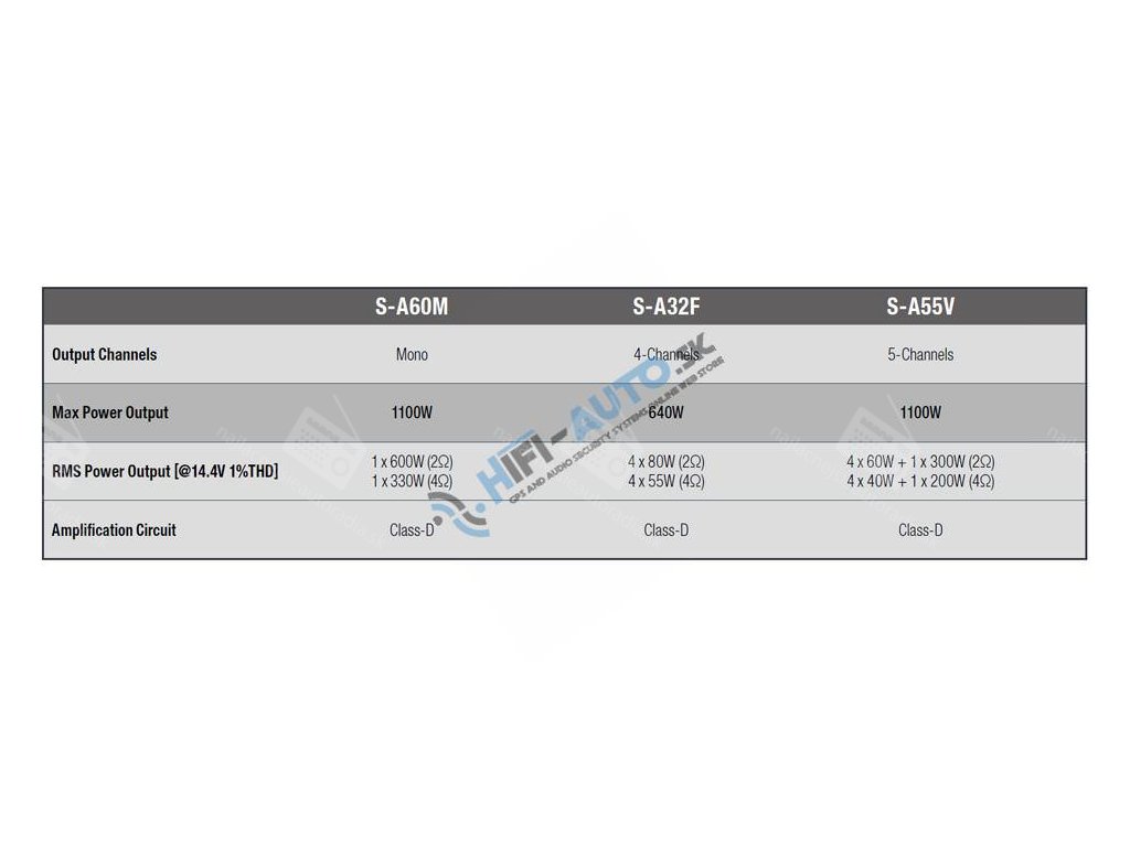Alpine predstavuje úplne nové zosilňovače série S - perfektná zhoda s reproduktormi série S. Tieto zosilňovače majú vynikajúci pomer cena/výkon v kategórii triedy D, vyznačujú sa veľmi vysokou tepelnou odolnosťou a nezastavia sa kvôli prehriatiu. Vo svojej cenovej relácii majú tiež vynikajúcu kvalitu zvuku.