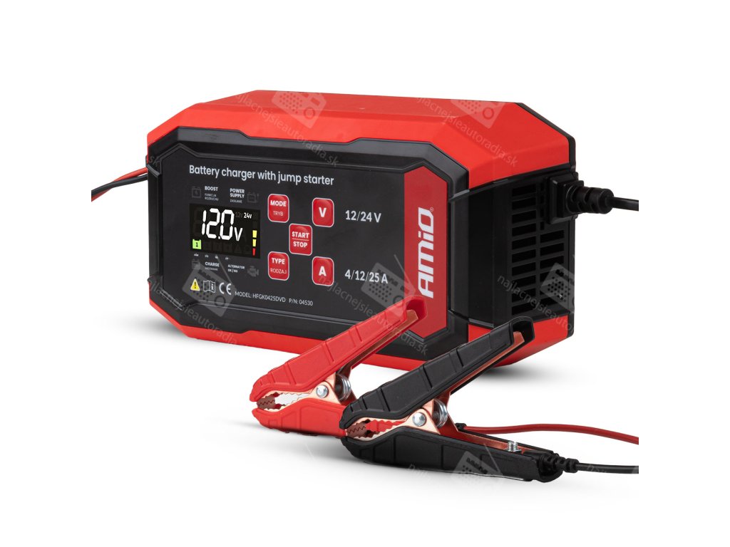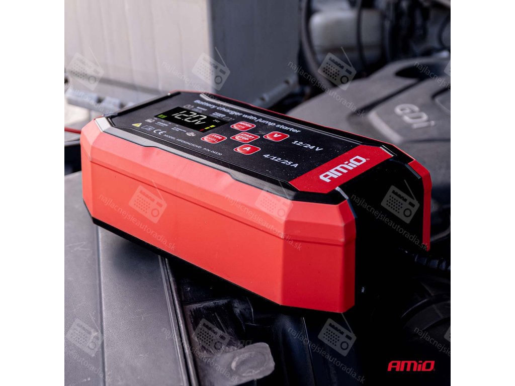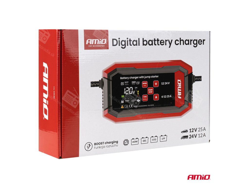 Digitálna nabíjačka AMiO PRO 12/24V MAX 25A s funkciou štartovania je zariadenie pre náročných používateľov, ktoré zaručuje rýchle, bezpečné a profesionálne nabíjanie a spoľahlivú podporu pri štartovaní v každej situácii, ideálne pre osobné automobily, nákladné vozidlá, poľnohospodárske stroje a profesionálne zariadenia.