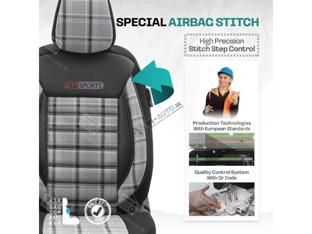 Štandardné poťahy majú certifikovaný šev AIRBAGový, vďaka čomu sú vhodné pre autá s bočnými airbagmi v sedadlách, ako aj pre štandardné sedadlá. Vďaka použitiu špeciálneho švu pokrývajú sedadlá úplne bez toho, aby narúšali prácu AIRBAGOV.